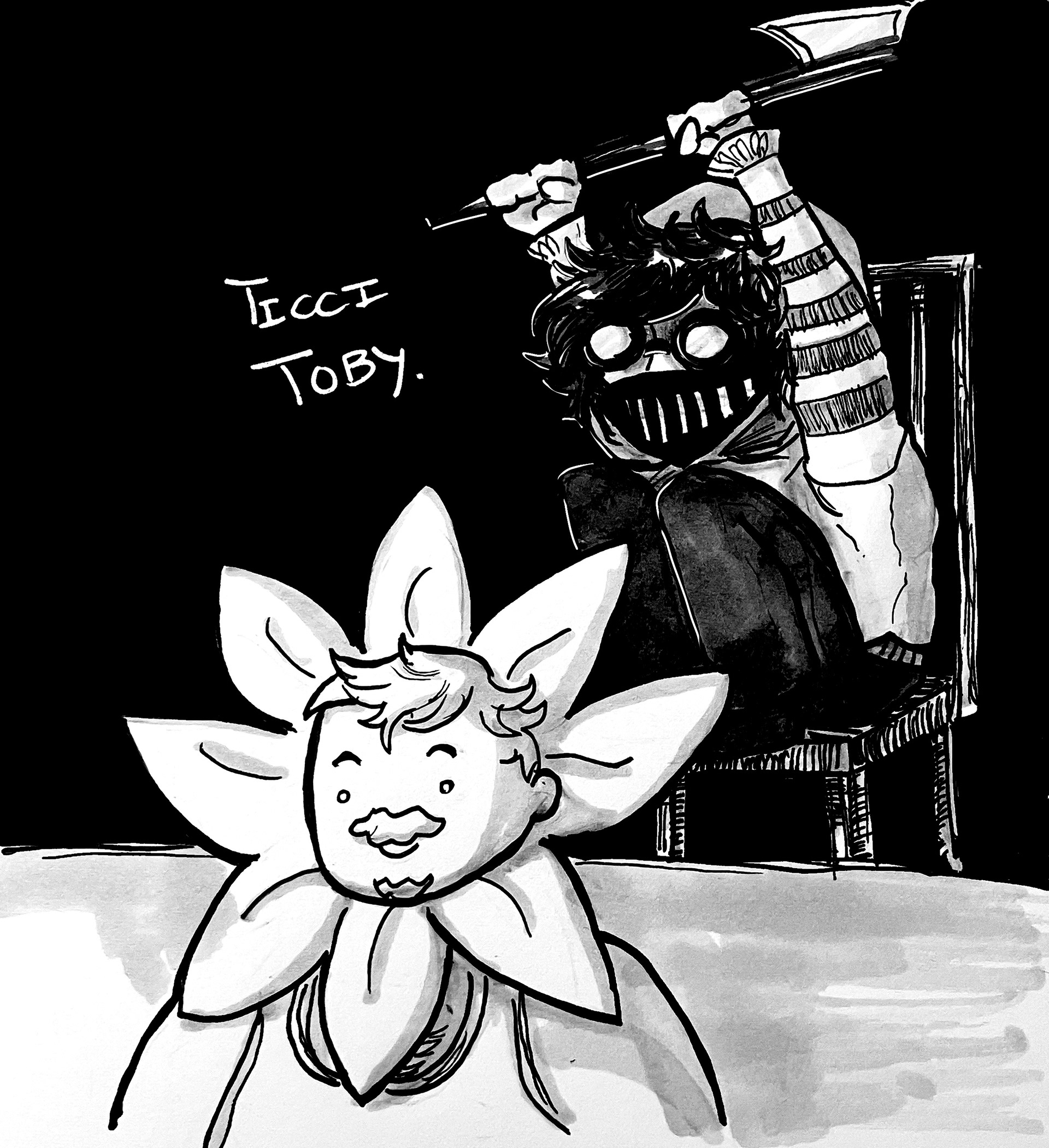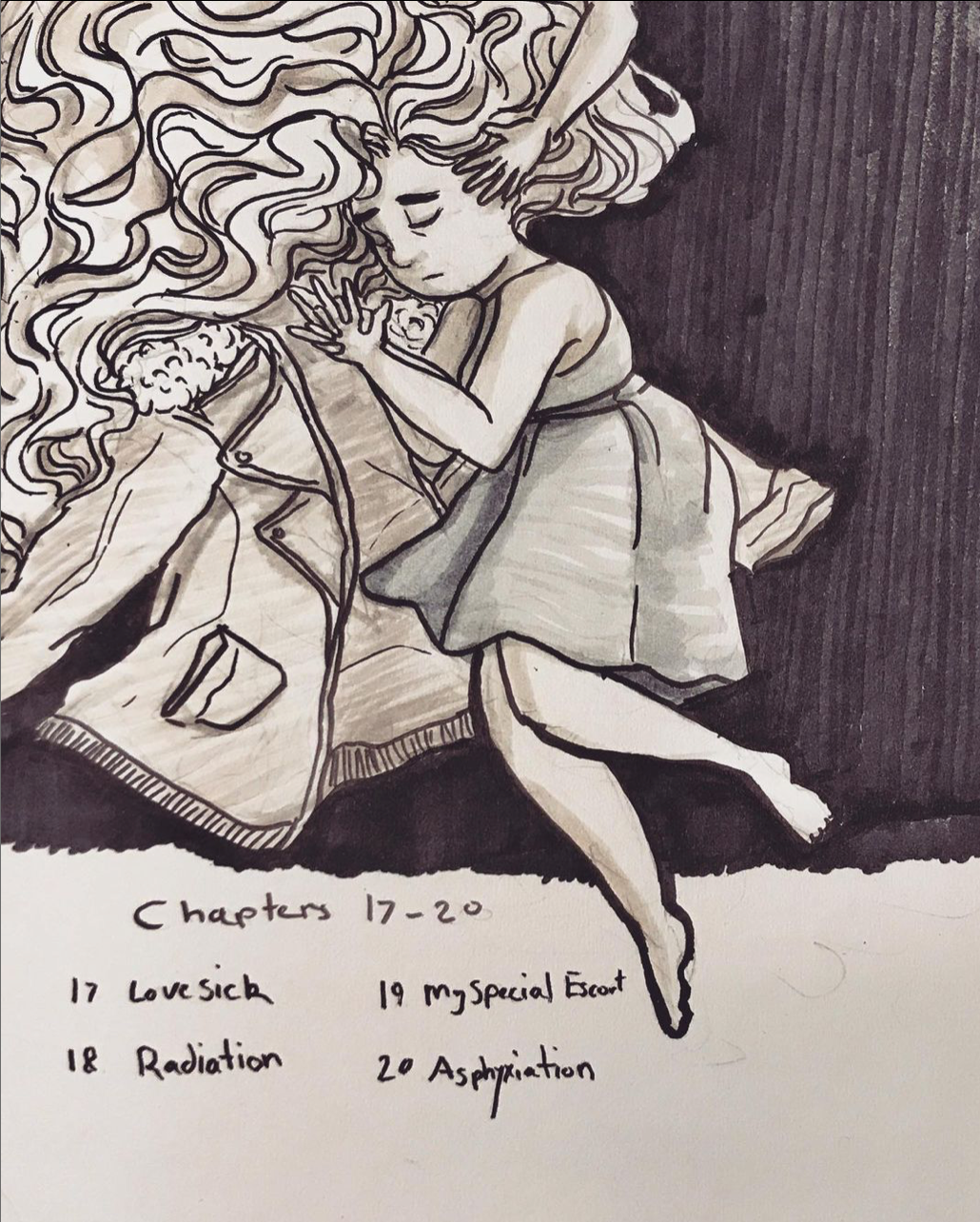 It was quite difficult to summarize 4 chapters per drawing. I'd include who or what was most relevant in all those chapters. I find it interesting that I didn't include the faces of our antagonists, only the back of their heads or hands.